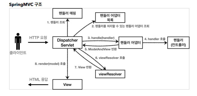 - ModelAndView 반환: 핸들러 어댑터는 핸들러가 반환하는 정보를 ModelAndView로 변환해서 반환한다.