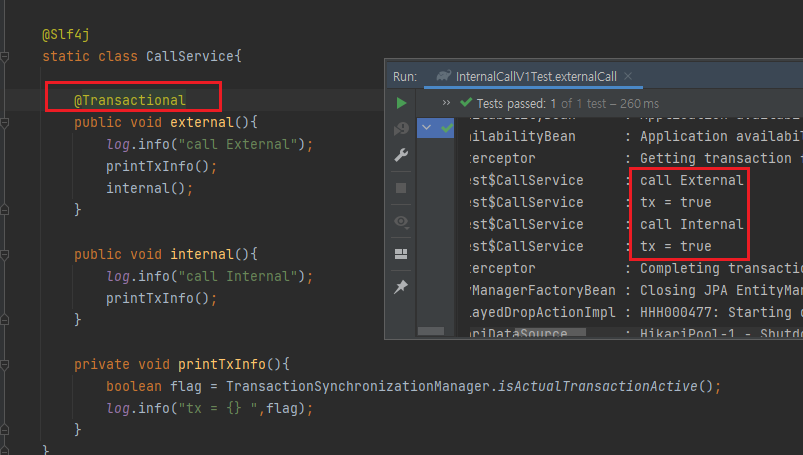 애노테이션이 없는 external, 있는 internal 모두 트랜잭션이 적용되지 않았다.
