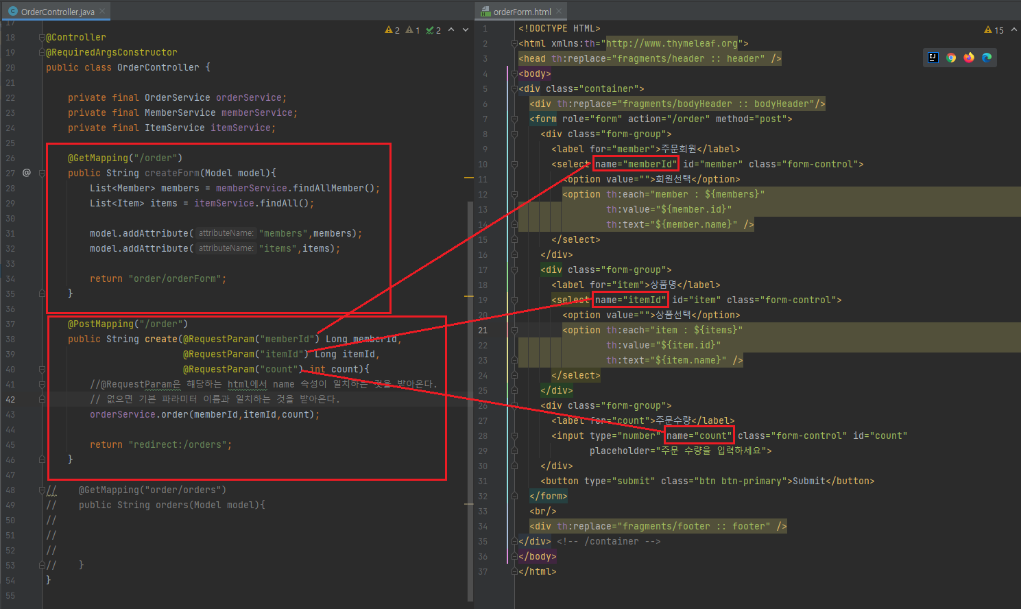 이전에 사용했던 @RequestParam은 get 요청으로 쓰였지만 이번엔 post 요청으로 쓰였다.